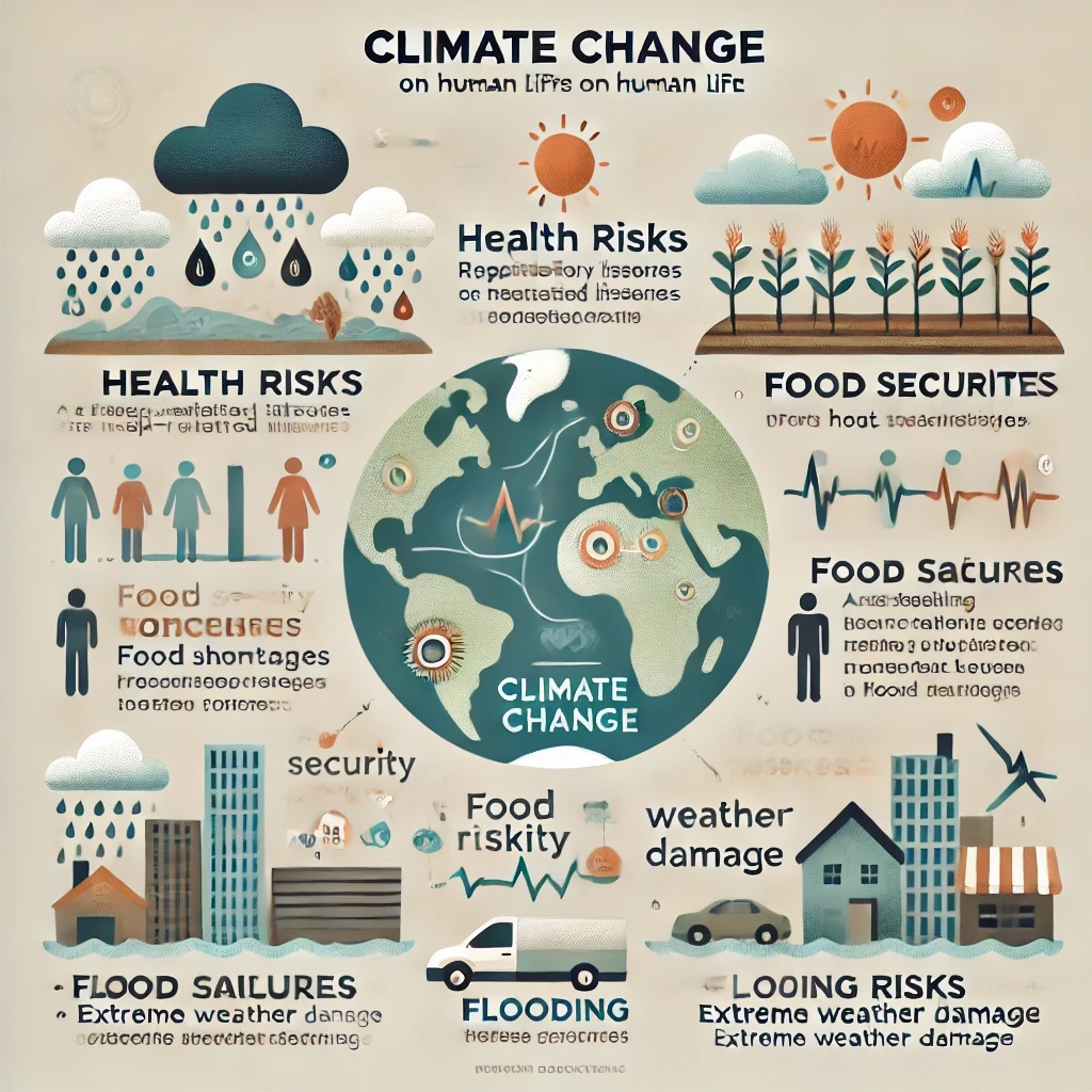 - 건강 문제: 폭염, 대기 오염 등으로 인해 호흡기 질환, 심장병 등의 발생 위험이 증가합니다.