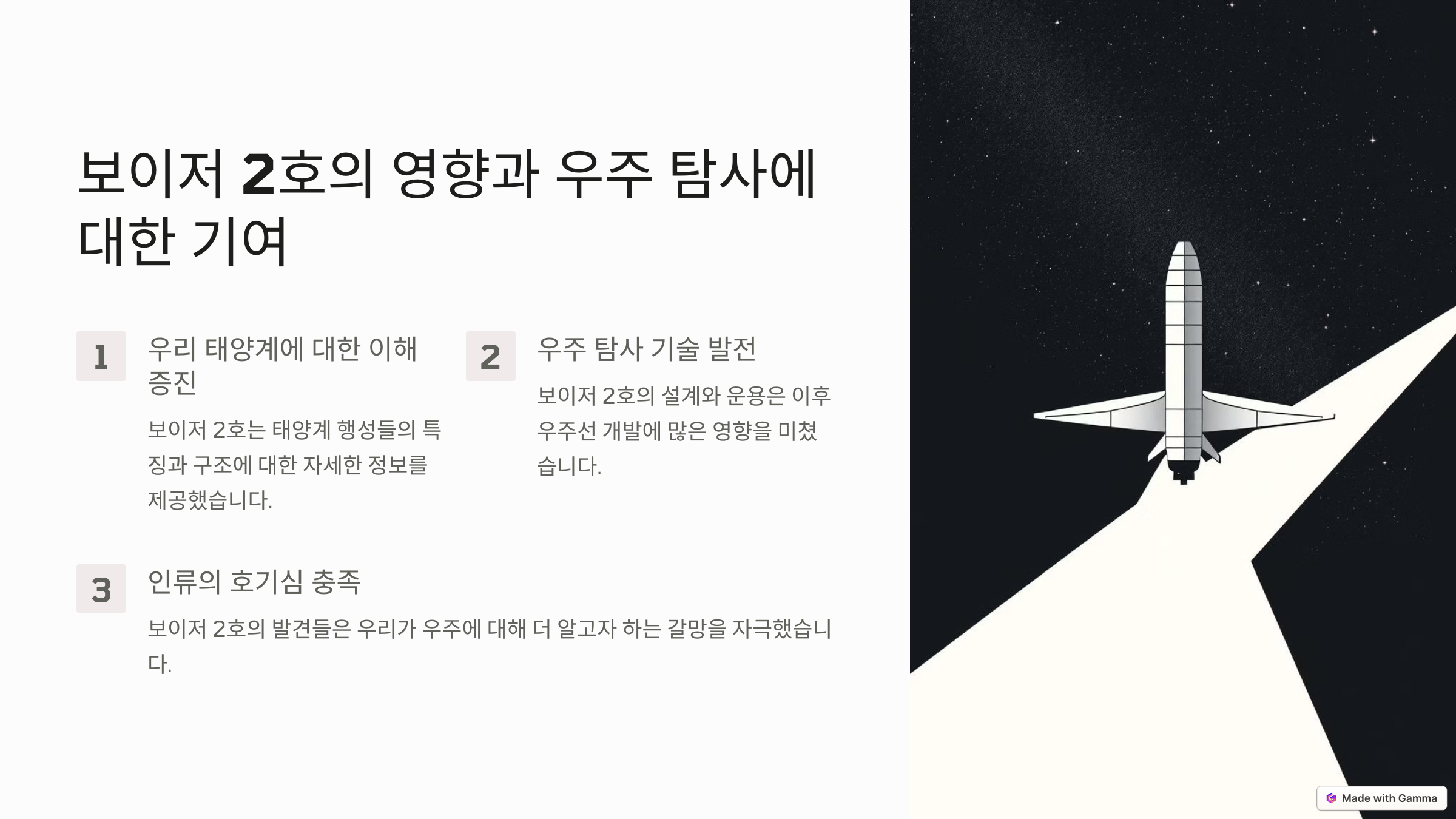 보이저 2호는 태양계를 넘어 성간 우주로 향한 인류의 대표적 도전이며, 현재도 가장 먼 거리에서 데이터를 전송하는 탐사선 중 하나입니다. 보이저 2호의 임무는 우주 탐사의 끊임없는 가능성과 인류의 과학적 호기심을 상징합니다.
