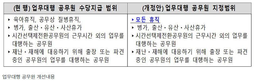 • 업무대행수당 지급 확대: 기존에는 휴직 사유에 따라 업무대행수당 지급 여부가 달랐으나, 이제부터는 휴직 사유와 무관하게 모든 공무원에게 업무대행수당이 지급됩니다. 이를 통해 휴직 사유에 관계없이 동등하게 대우받을 수 있게 되었습니다.