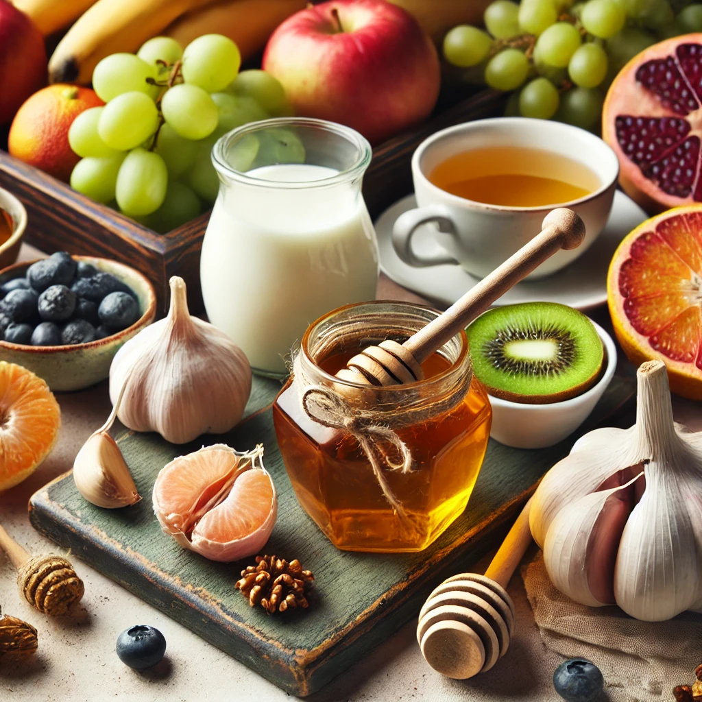 - 꿀: 항산화 물질이 풍부해 감기 예방에 효과적이며, 차와 함께 마시면 더욱 좋습니다.
