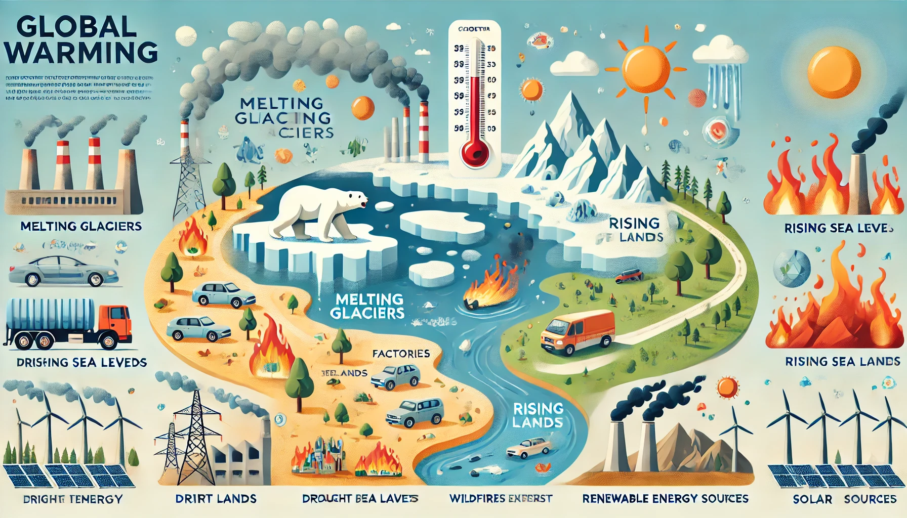- 빙하와 극지방 얼음이 녹으면서 해수면이 상승하고 있습니다.