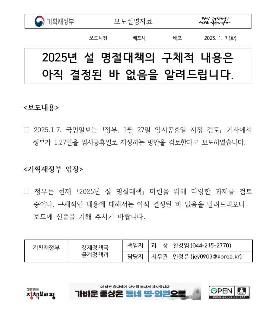 2025년 1월 7일, 일부 언론에서는 정부가 1월 27일을 임시공휴일로 지정하는 방안을 검토하고 있다는 기사를 보도했습니다. 이에 대해 기획재정부는 보도설명자료를 통해 해당 기사 내용이 구체적으로 결정된 바 없으며, 다양한 대책을 검토 중임을 명확히 했습니다.