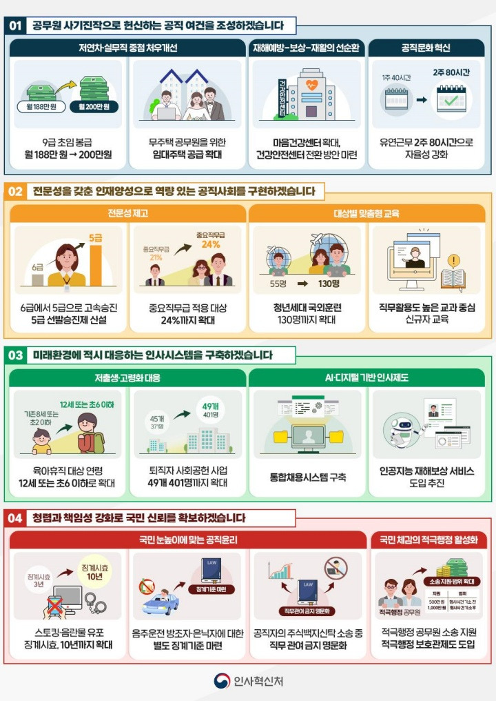 - 성과 중심의 공직사회 구현: 직무 수행 능력과 성과를 바탕으로 공무원을 평가하고 보상.