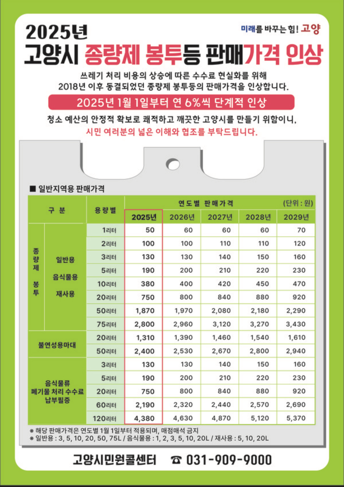 고양시의 종량제 봉투 가격은 2025년부터 매년 6%씩 단계적으로 인상될 예정입니다. 일반용, 음식물용, 재사용 봉투와 불연성용 마대 및 음식물류 폐기물 처리 수수료 등이 포함됩니다.